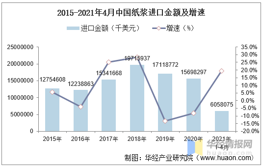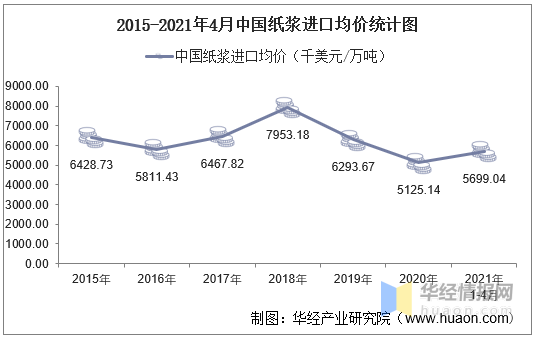 2021年1-4月中国纸浆进口数量为1063万吨,相比2020年同期增长了75万吨,同比增长8.2%;进口金额为6058075千美元,相比2020年同期增长了964222千美元,同比增长19.4%;2021年1-4月中国纸浆进口均价为5699.04千美元/万吨。